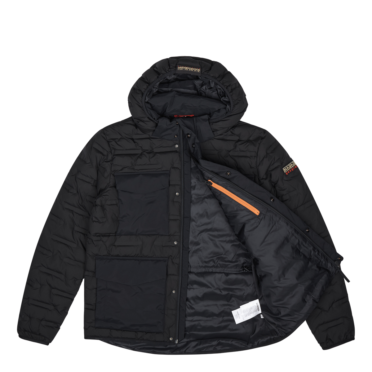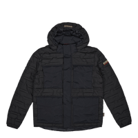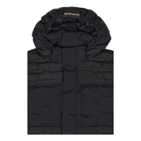 Pufferjacka från Napapijri som är varmt fodrad. Jackan har resårkanter runt luvan, ärmsluten samt nederkanten och avslutet är rakt. Två sidofickor finns samt två bröstfickor med ett ficklock. Runt midjan finns en justerbar dragsko.