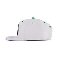 The hat features a structured crown and a flat brim, giving it a modern and stylish silhouette. The white colorway makes it versatile and easy to pair with any outfit, while the snapback closure allows for a customizable fit.