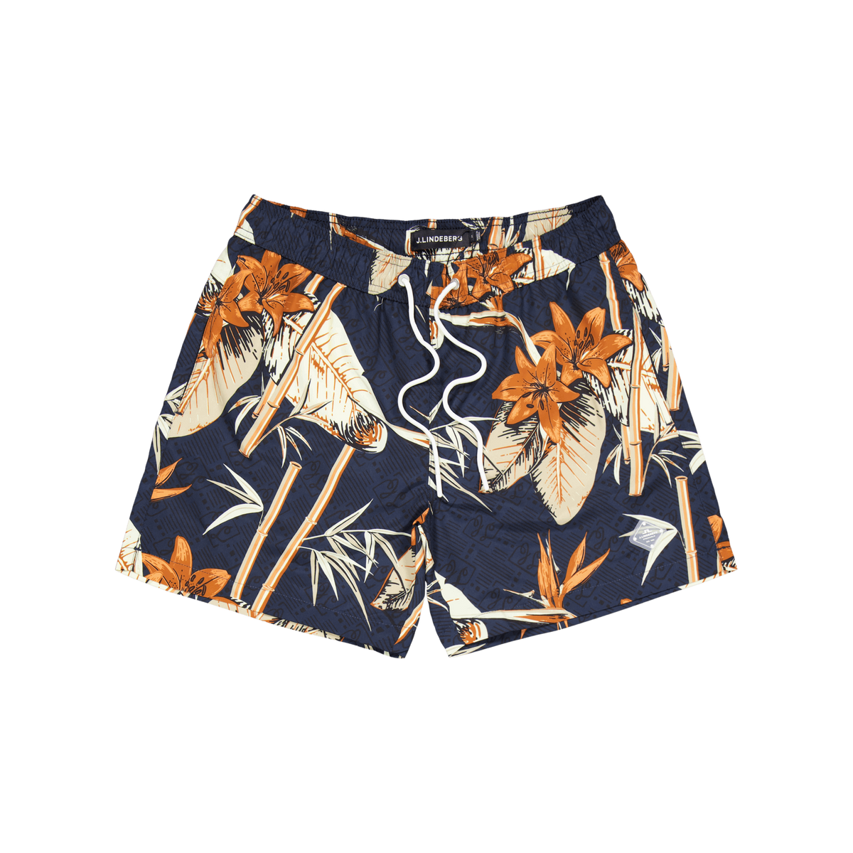 Swimming trousers from J Lindeberg. Drawstring and elasticated waist. Rubberised logo on left leg. Two front pockets. One pocket at the back that closes with press studs.